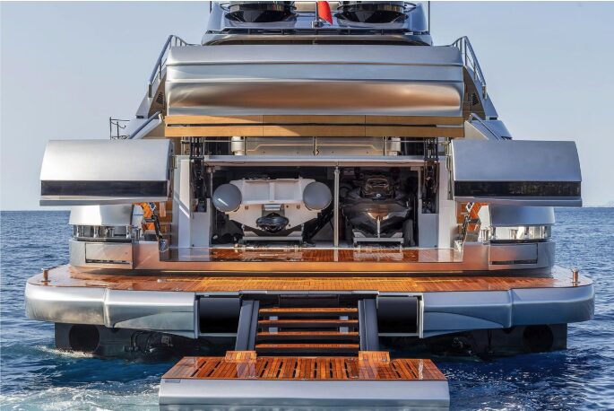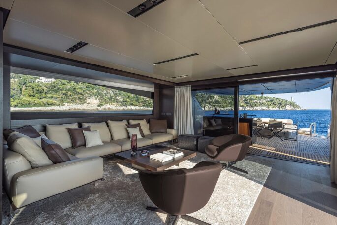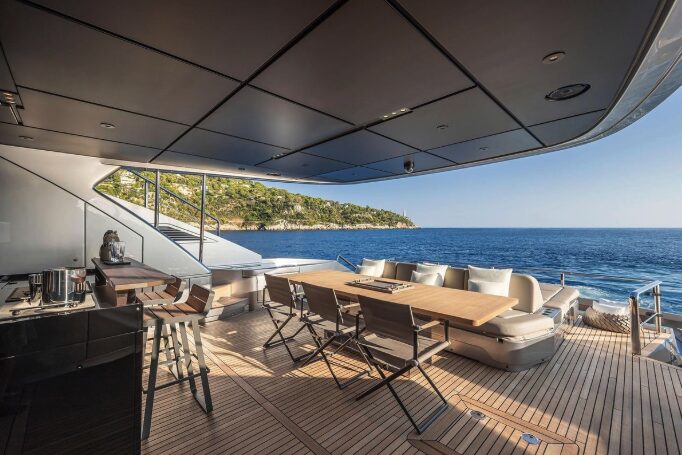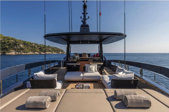 165m² outdoor spaces: Beach club, flybridge, bow lounge, and fold-out terraces.